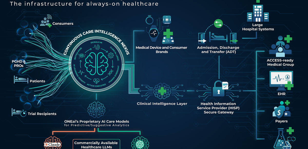 Not a bolt-on analytics tool — a complete network that closes the loop from patient signal to clinical action.